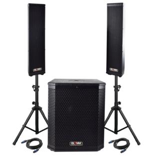 Sistema audio completo 2.1 composto da un subwoofer amplificato da oltre 600W con woofer da 12″ e da due speaker satelliti ognuno con 4 altoparlanti a 2 vie in grado di riprodurre una potenza massima di 150W l’una. Il woofer è amplificato e fornisce il segnale ai due satelliti tramite cavi speakon in dotazione. L’amplificatore monta un modulo MP3 avanzato con display LCD grafico e possibilità di gestire MP3 e segnali bluetooth provenienti da smartphone o tablet.